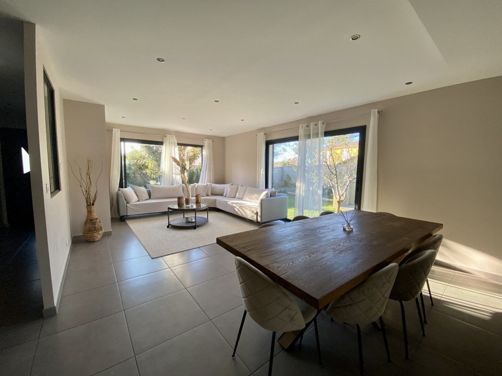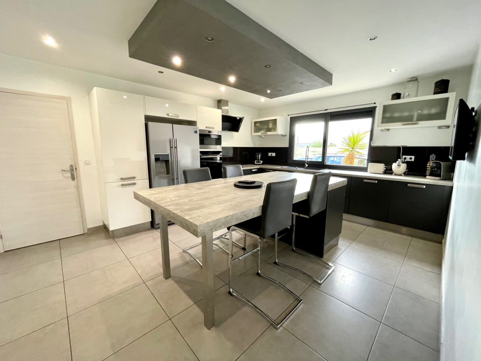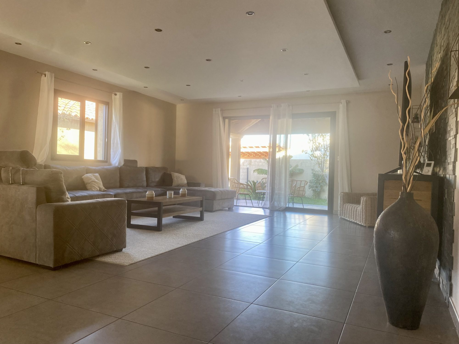 Cette maison offre des volumes généreux avec un séjour de plus de 72m2 lumineux grâce à ces trois baies vitrées donnant sur une terrasse en travertin.
