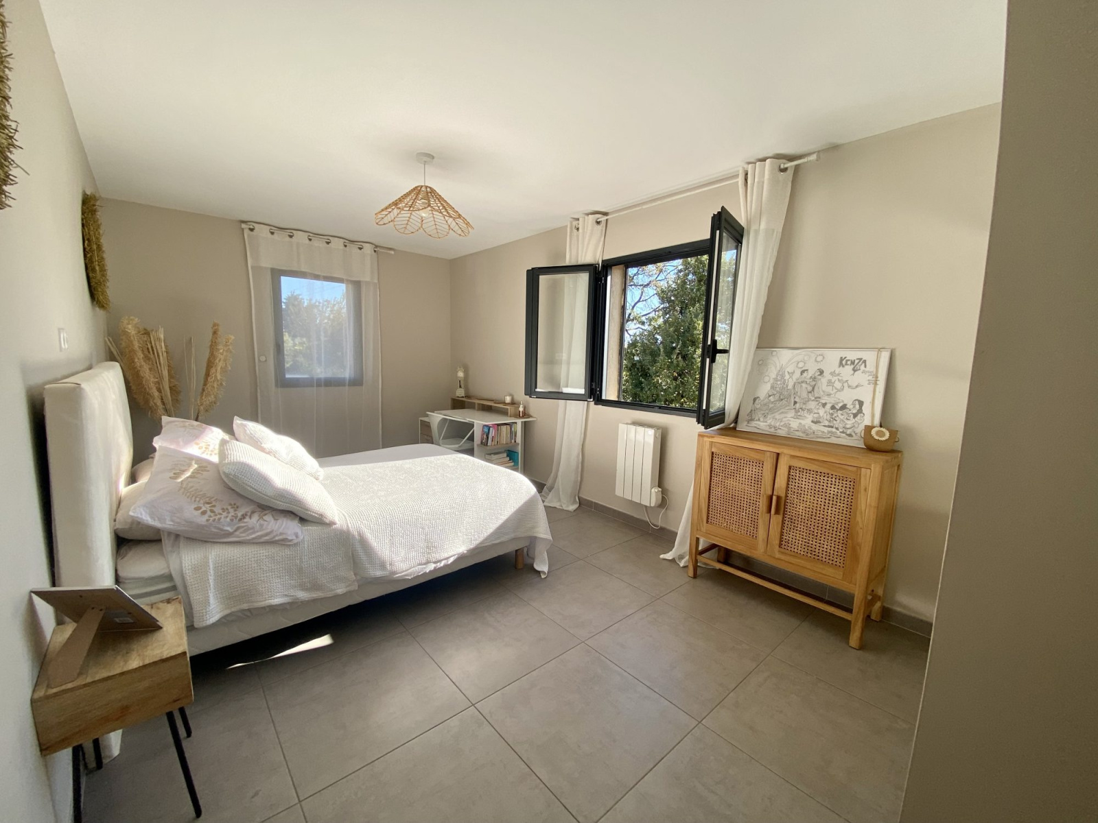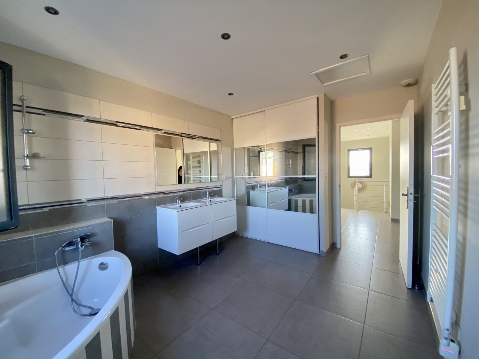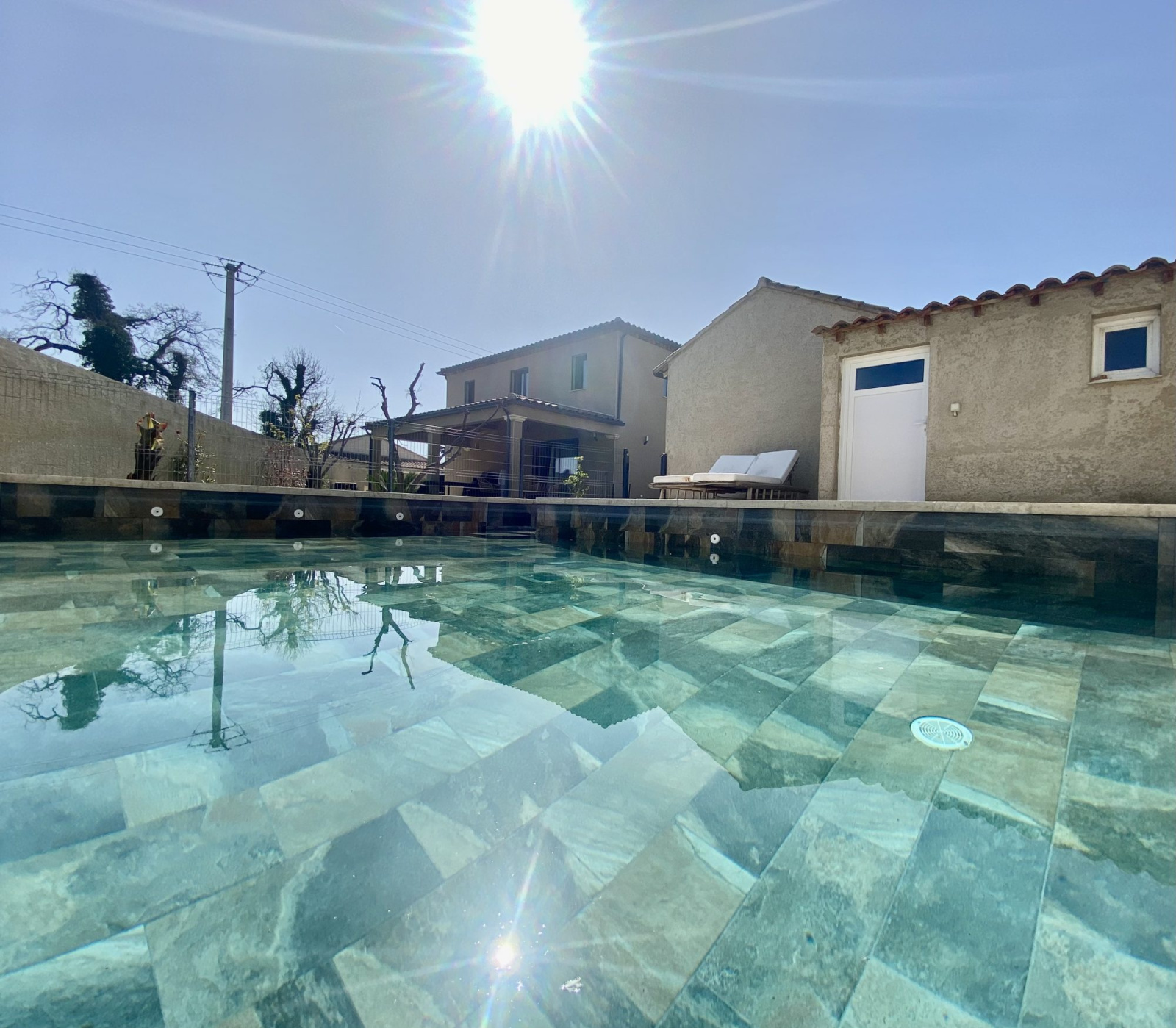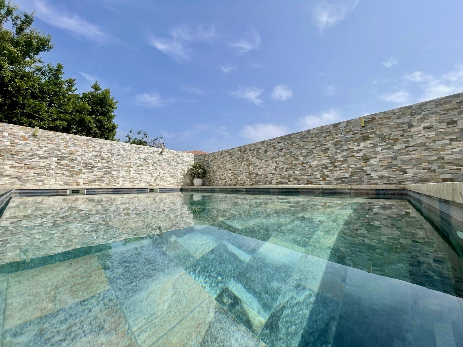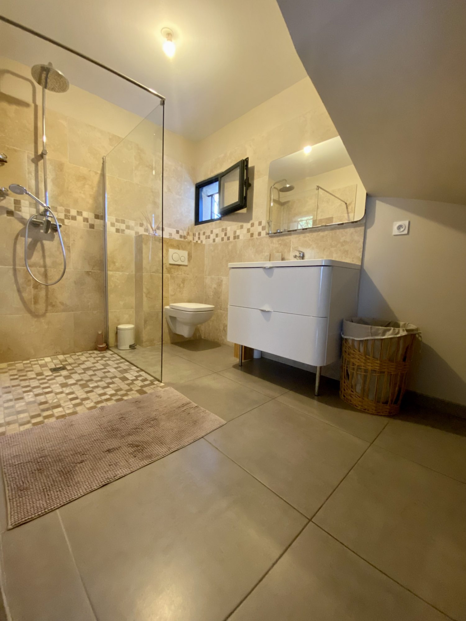 - Matériaux de qualité : menuiserie en aluminium, travertin
