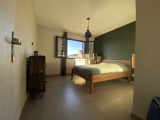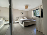 La cuisine semi-ouverte de plus de 21m2 entièrement aménagée et équipée, une chambre au premier niveau avec dressing, une salle de douche en travertin et un wc.